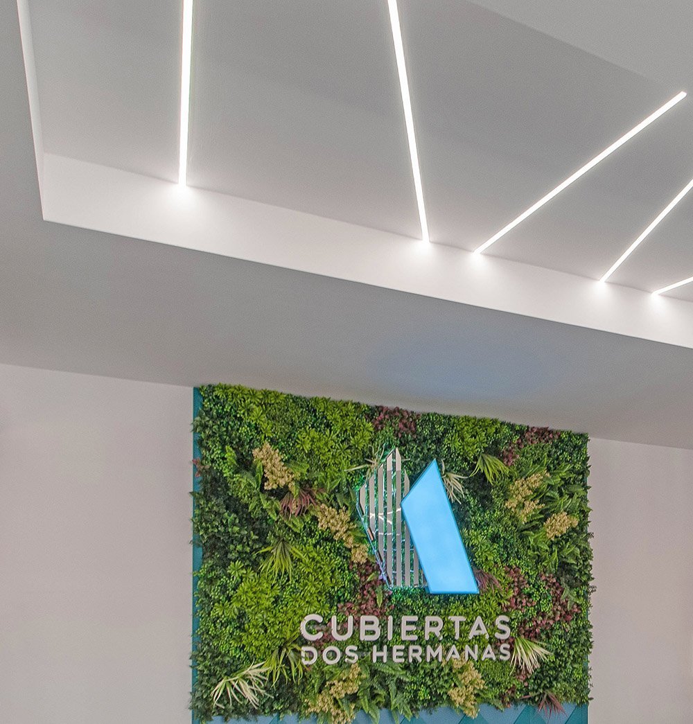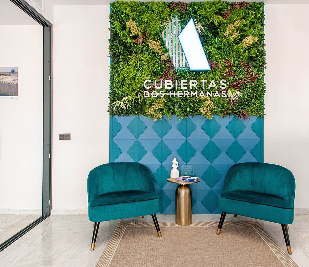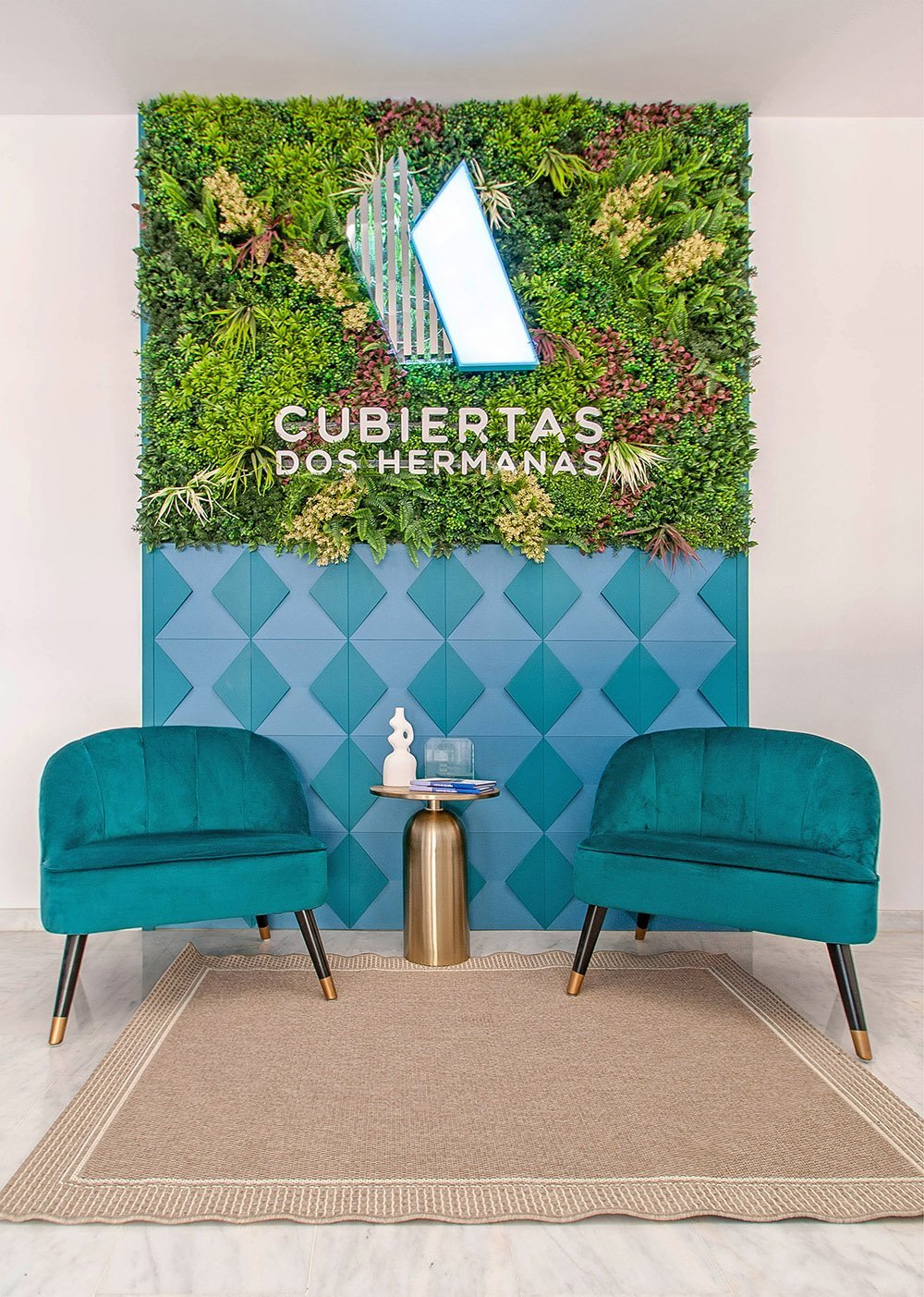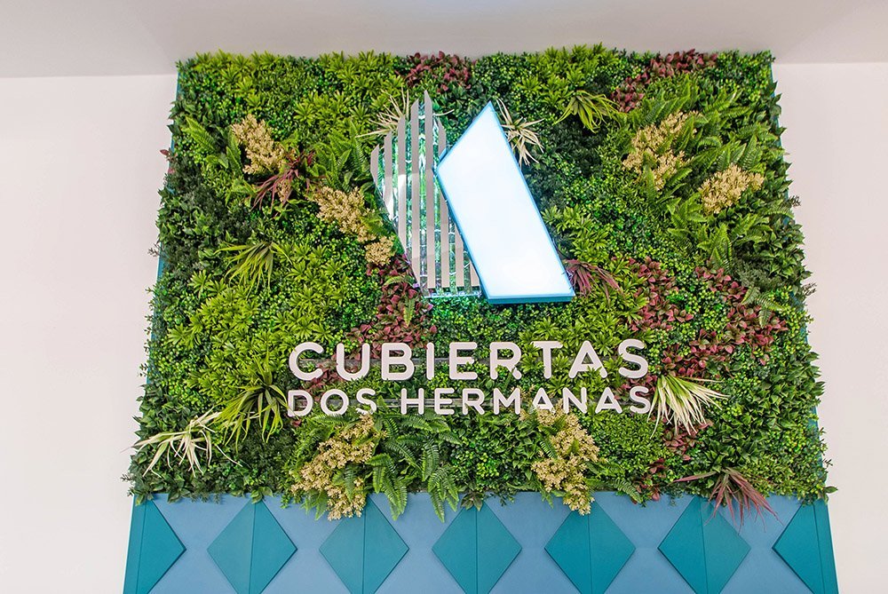 El logotipo, que antes pasaba desapercibido, cobra ahora todo el protagonismo en la recepción: ubicado sobre un jardín vertical e iluminado para convertirse en un punto focal que da la bienvenida y refuerza la imagen de marca desde el primer vistazo.