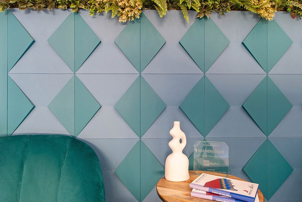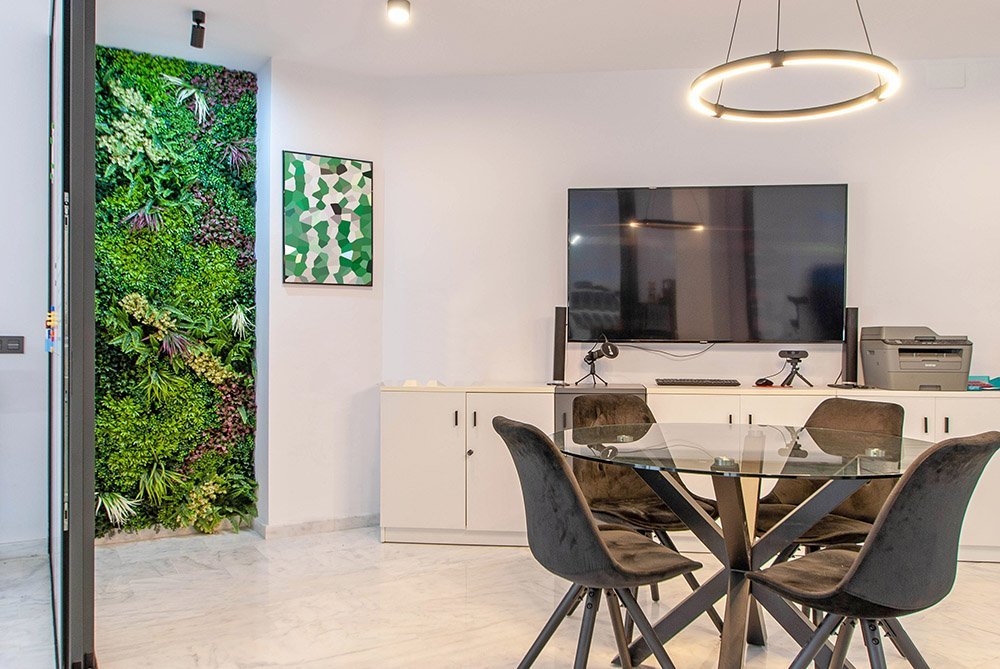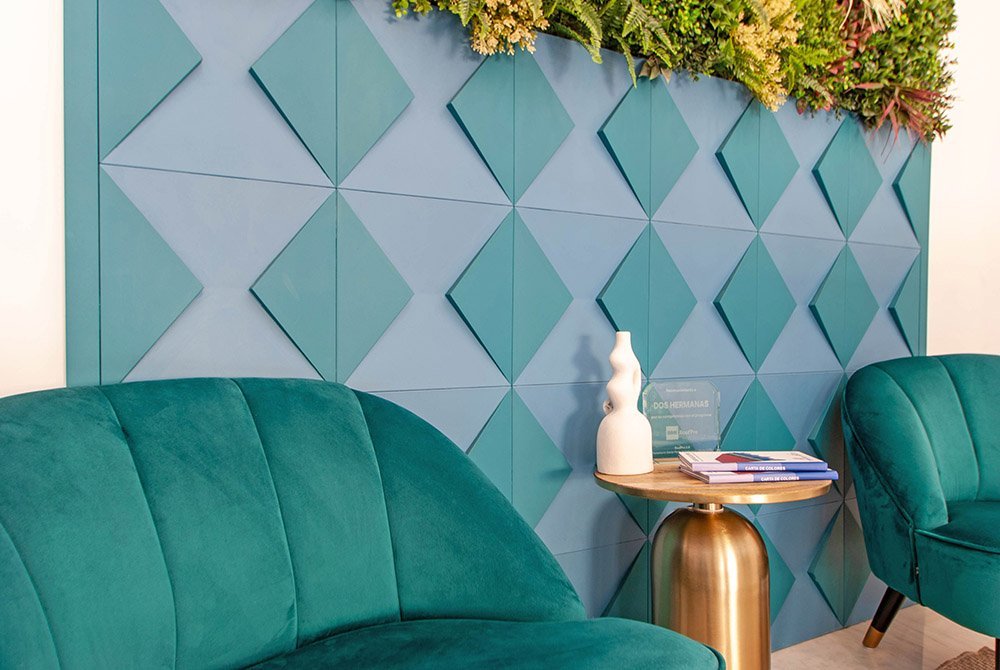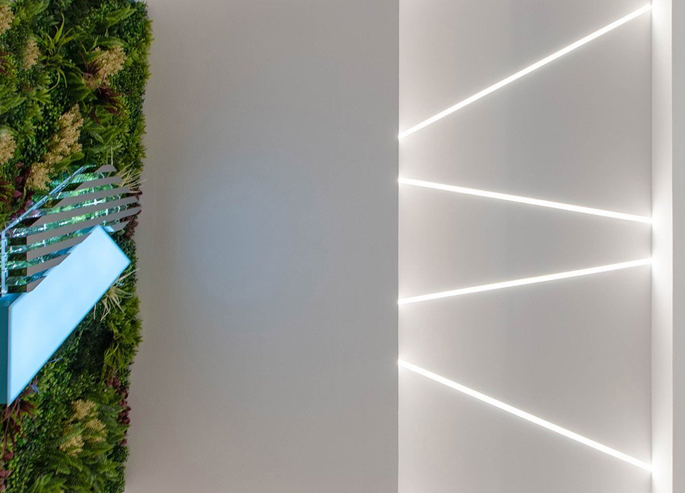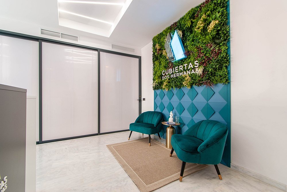 El logotipo, que antes pasaba desapercibido, cobra ahora todo el protagonismo en la recepción: ubicado sobre un jardín vertical e iluminado para convertirse en un punto focal que da la bienvenida y refuerza la imagen de marca desde el primer vistazo.
