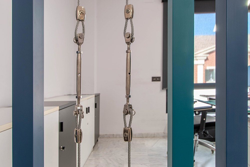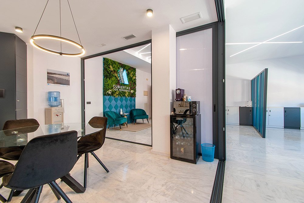 Incorporamos materiales como el policarbonato y los cables tensores, elementos habituales en los proyectos de esta empresa dedicados a cubiertas industriales. Integrarlos en el diseño aportó carácter y autenticidad, creando un espacio único y alineado con su identidad.