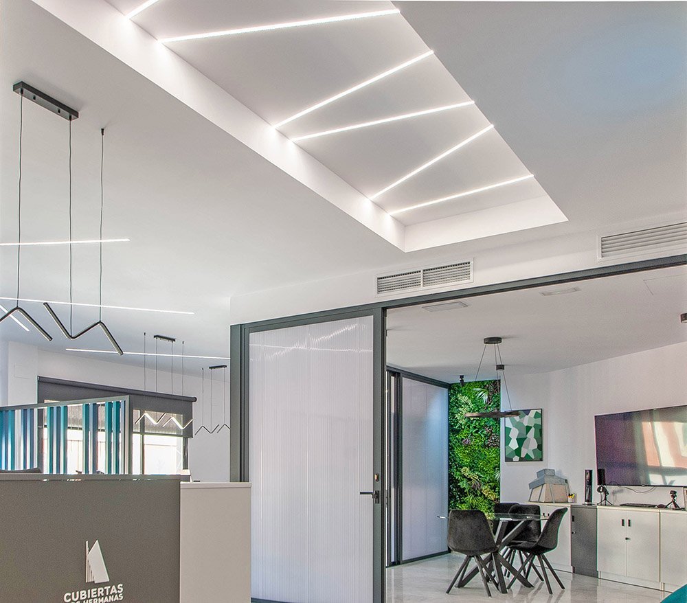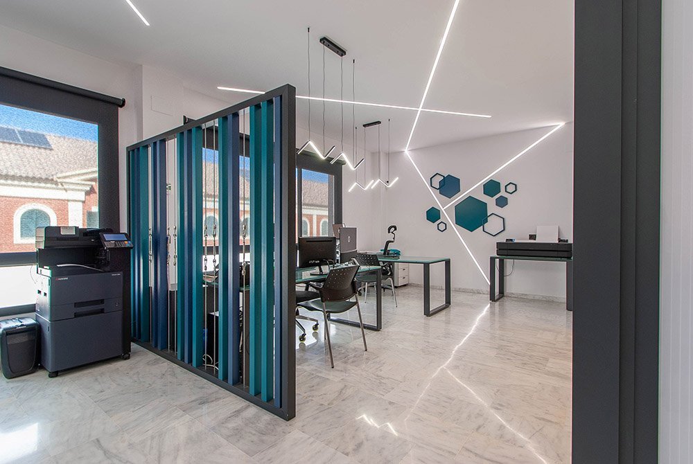 La entrada se transformó en un recorrido guiado por la iluminación del techo, con un foseado de luz que marca el camino hacia la sala de reuniones, ordenando el tránsito y aportando un toque contemporáneo. El resto de la oficina se complementa con un juego de luces integradas en techos y paredes, formando parte del diseño y creando una atmósfera moderna, actual y llena de vitalidad… exactamente como esta empresa joven y dinámica.